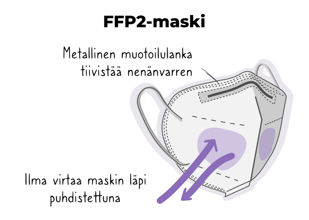 - Kasvomaskit ja hengityssuojaimet. Erityisesti tiiviit FFP2- ja FFP3 -hengityssuojaimet suojaavat muita ja myös itseä. Lisätietoa kasvomaskien käytöstä THL:n sivulla ja TTL:n sivuilla suojainten teknisistä ominaisuuksista. Lisätietoa FFP-suojaimen turvallisesta uusiokäyttämisestä.