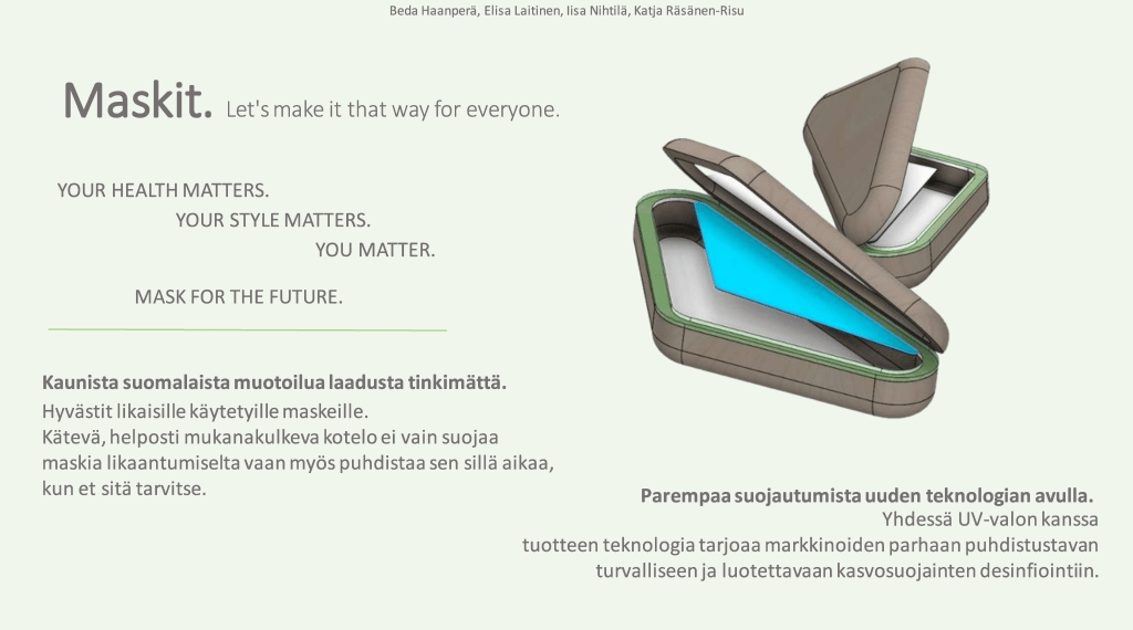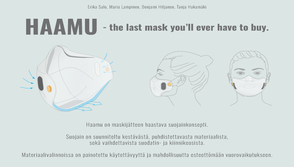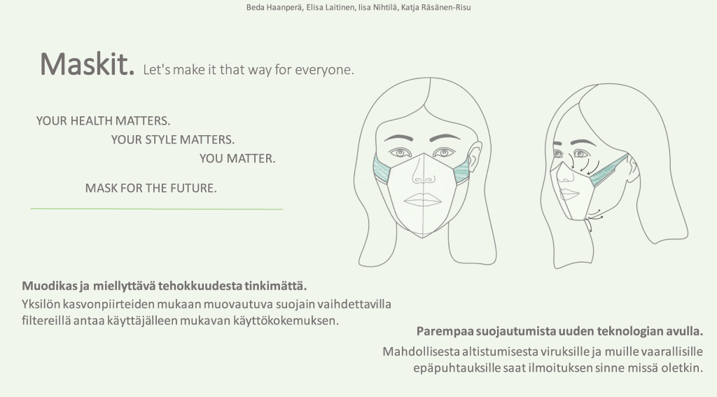 Tulevaisuuden maskit voivat suojata paitsi aerosoleina ja pisaroina leviäviltä taudinaiheuttajilta, myös esimerkiksi siitepölyltä ja hiekkapölyltä. Hyvän suodatuskyvyn lisäksi kasvosuojaimen on tärkeää istua kasvoille tiiviisti, että se suojaa tehokkaasti myös aerosoleilta ja pölyltä. Yksi tärkeimmistä ratkaistavista ongelmista on maskijäte, joka myös huolettaa monia maskien käyttäjiä Suomessa. Tulevaisuudessa ekologisesti kestävämmät suojaimet voisivat olla pitkäikäisiä, uudelleenkäytettäviä ja kierrätettäviä. Maskin käytettävyyttä ja mukavuutta haittaavat monet tekijät, kuten esimerkiksi korvien takaa ihoa ärsyttävät sangat, maskin unohtuminen ja sosiaalinen haitta. Opiskelijoiden kehittämät konseptit vastasivat moniin näihin haasteisiin.