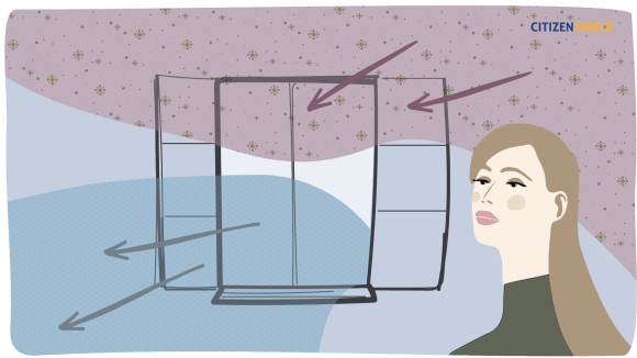 Sisäilma kulkeutuu ulos avoimesta ikkunasta ja tilalle tulee ulkoilmaa. Jos ilmassa on virushiukkasia, myös niitä kulkeutuu ulos.