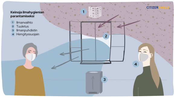Ilmanpuhdistimen kanssa tärkeintä on varmistaa, että se tuottaa riittävästi puhdasta ilmaa kyseessä olevaan tilaan. Huomioi myös ilmanpuhdistimen tyyppi: ionisaattoreista ei ole vastaavaa hyötyä virustautien leviämisen torjunnassa. Voit lukea lisää erilaisista ilmanpuhdistimista ja saada neuvoja laitteen valintaan Hengitysliiton sivuilta.